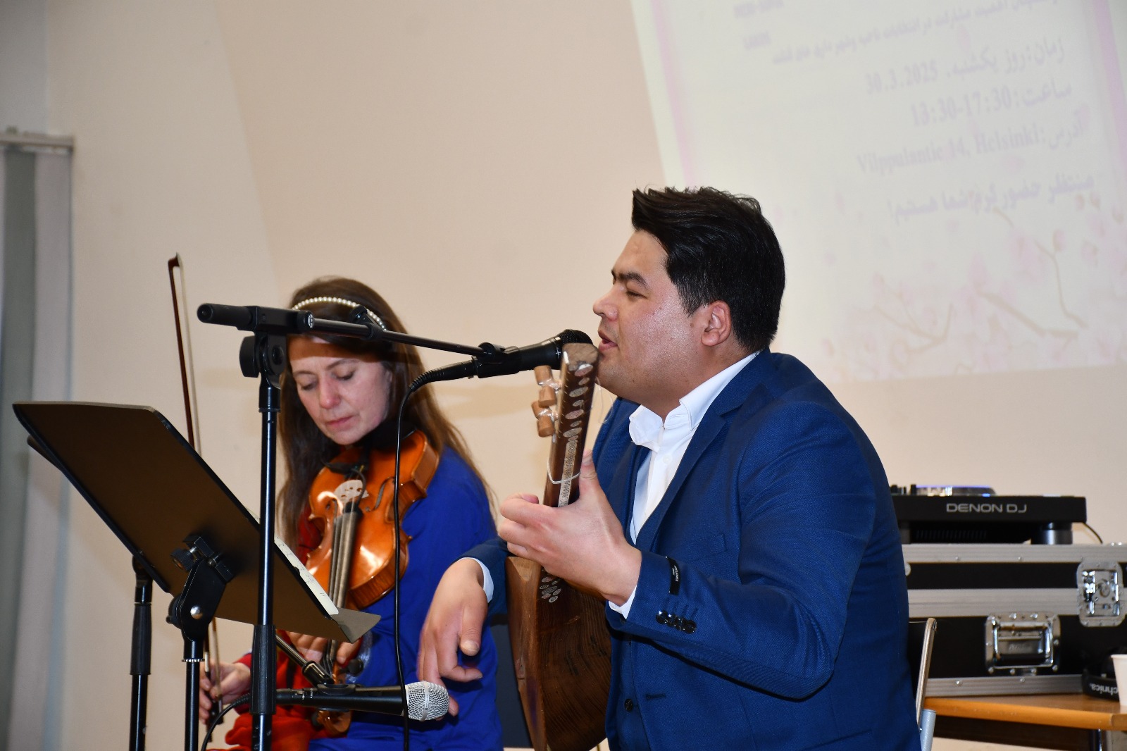 In the second part of the event, a cultural and artistic celebration was held in honor of Nowruz, featuring performances by Afghan-origin artists. This segment opened with a speech by Mr. Nabi Esmatzadeh, a member of the executive board of the Hazara Culture House in Finland. Following this, Ali Zargham, a well-known dambura player and folk singer, along with Hafiz Habibi, Ms. Miri Sofia, and DJ Ali performed traditional music, receiving warm appreciation from the audience.